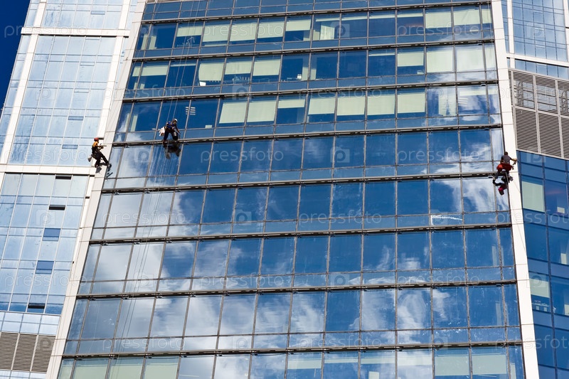 Мужчины моют окна небоскреба