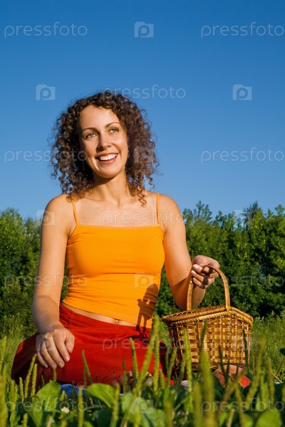 Молодая женщина с корзиной на поляне