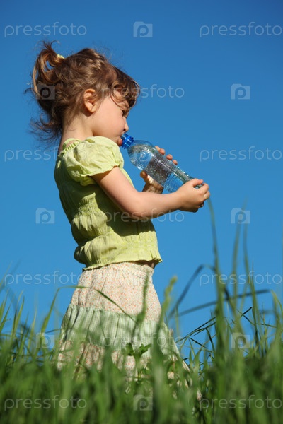 Девочка стоит в траве и пьет воду из пластиковой бутылки
