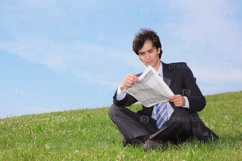 Бизнесмен сидит на лугу и читает газету