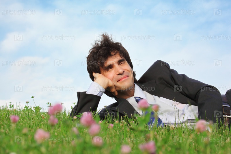 Бизнесмен лежит на траве