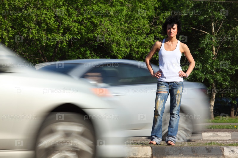 Девушка стоит на дороге среди автомобилей
