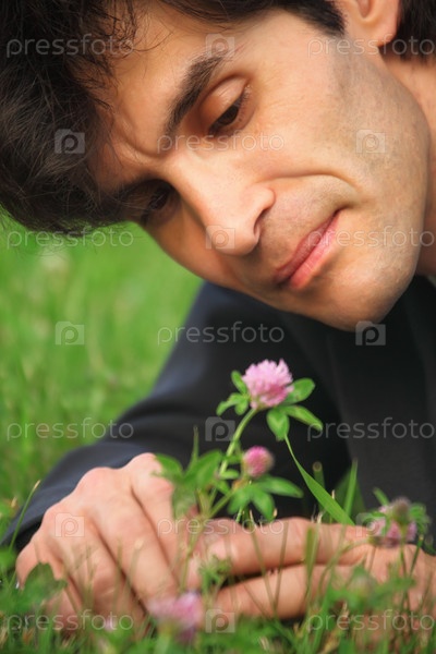Бизнесмен смотрит на цветок клевера