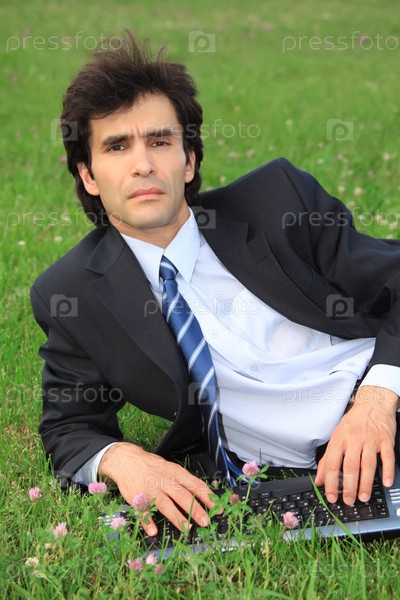 Бизнесмен лежит на траве с ноутбуком