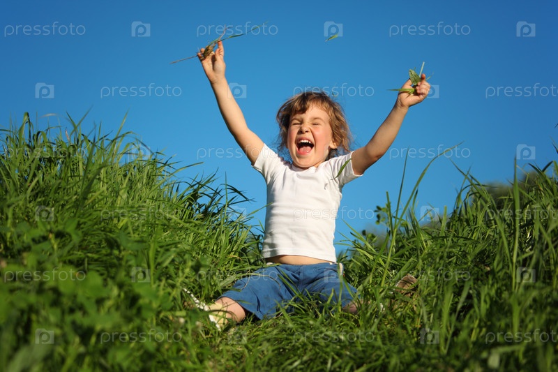Девочка сидит на траве и смеется