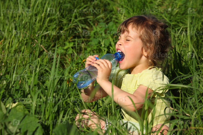 Девочка пьет воду сидя на траве