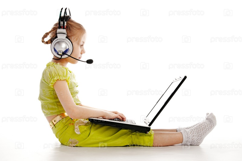 Девочка в больших наушниках с микрофоном работает за ноутбуком