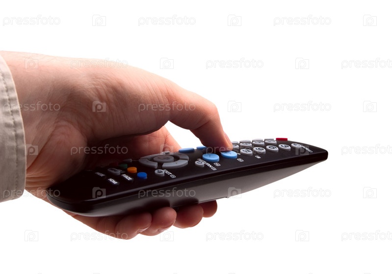 Рука с пультом управления на белом фоне