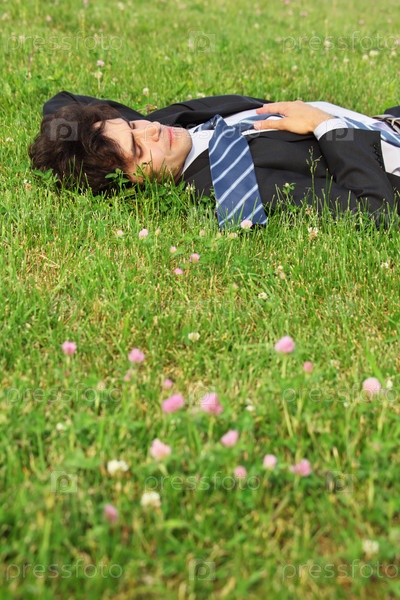Бизнесмен отдыхает на траве