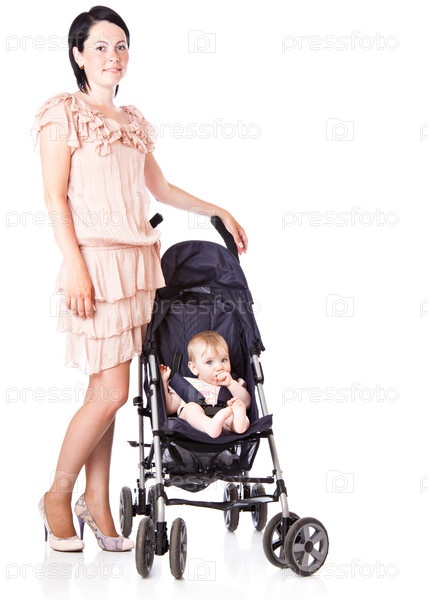 Мама и маленькая дочь в коляске, изолированные на белом фоне