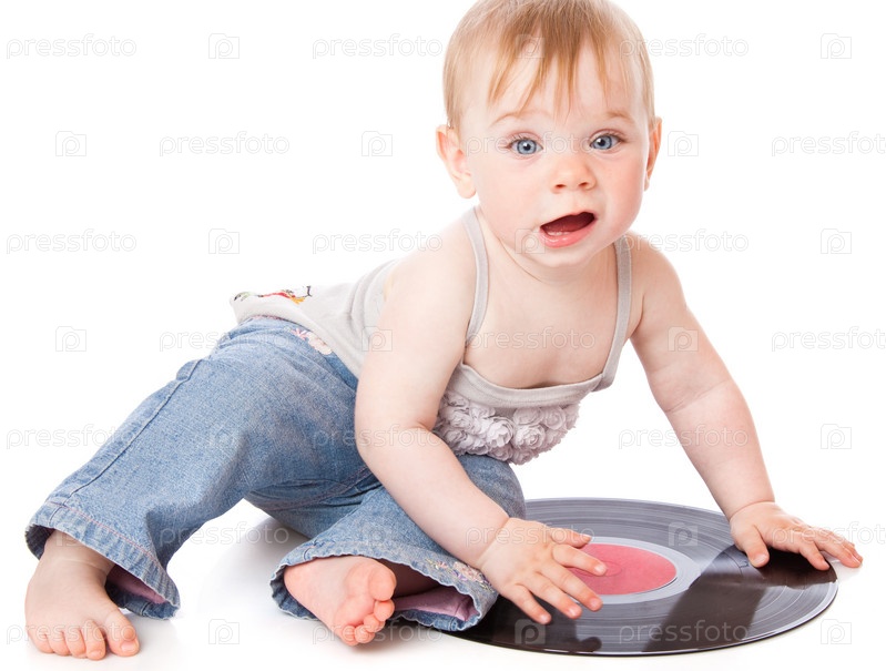 Маленький ребенок с граммофонной пластинкой, изолированные на белом фоне