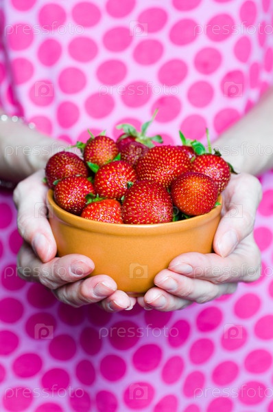Женские руки держат спелую клубнику в чаше