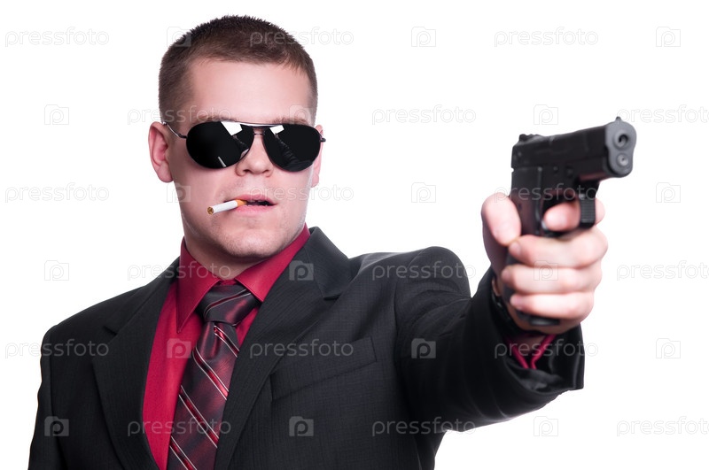 Мужчина в костюме, очках и с пистолетом на белом фоне