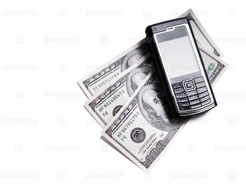 Сотовый телефон на долларовых купюрах на белом фоне