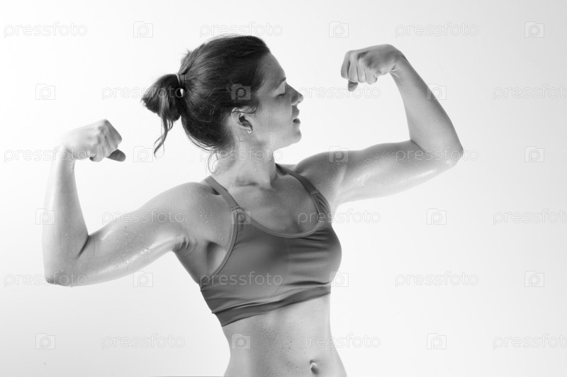 Фитнес-женщина показывает бицепсы