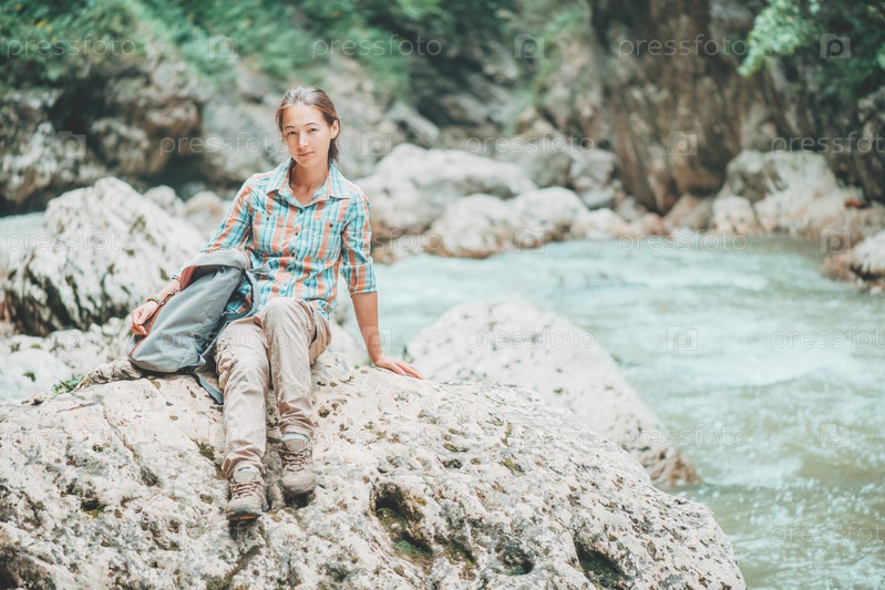 Женщина, сидя на берегу реки