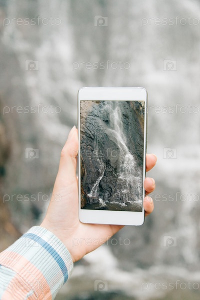 Женщина фотографирует водопад со смартфоном