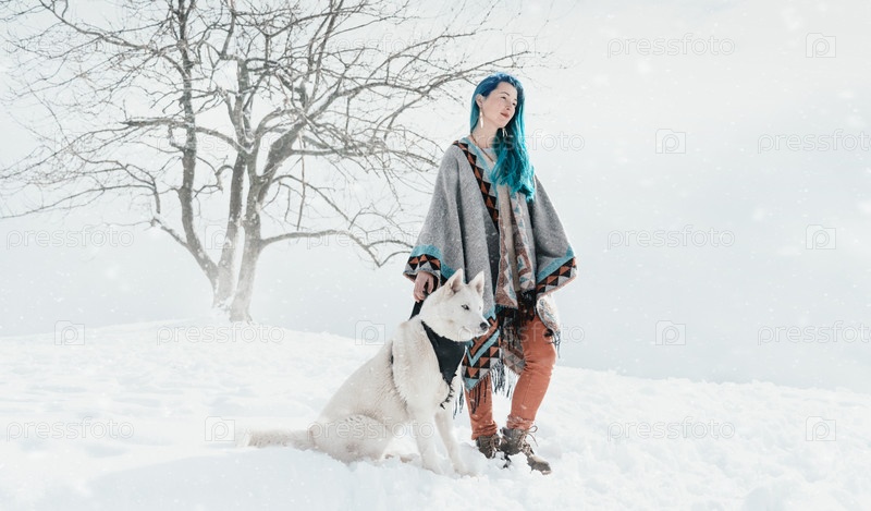 Красивая женщина с хаской в зимний период