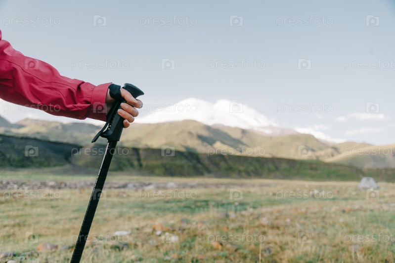 Рука с треккинговой палкой на открытом воздухе
