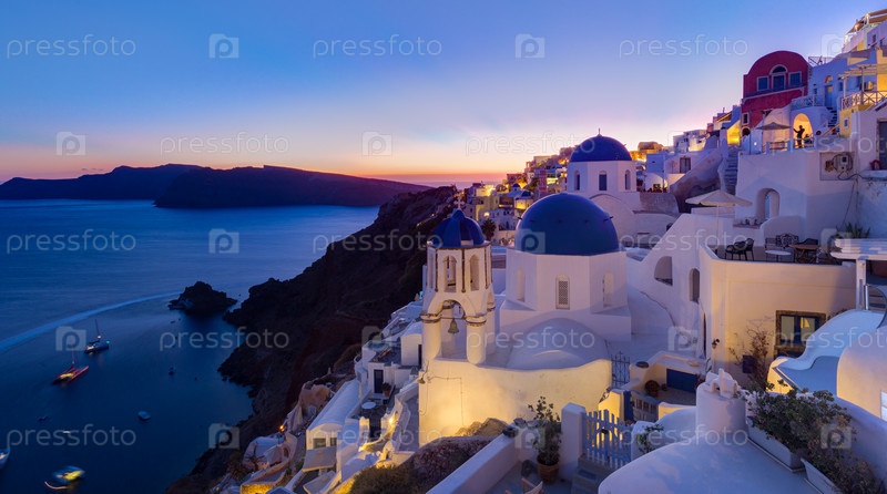Традиционная греческая деревня Иа в сумерках, остров Санторини, Греция
