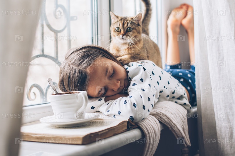 Девочка с кошкой на подоконнике