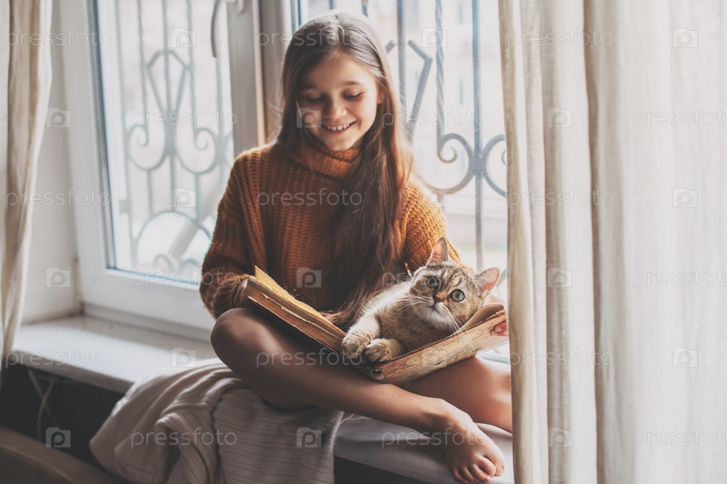 Ребенок читает книгу с кошкой