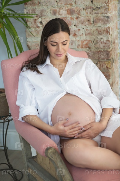 Молодая беременная женщина, сидя на диване в помещении