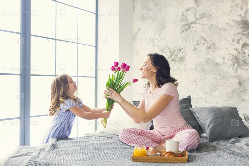 Молодая женщина с маленькой девочкой и цветами
