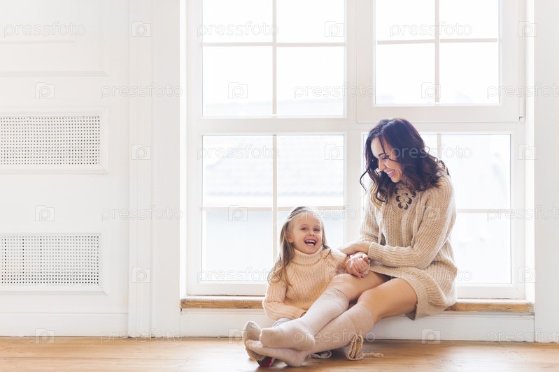 Молодая женщина утром с маленькой девочкой возле окна