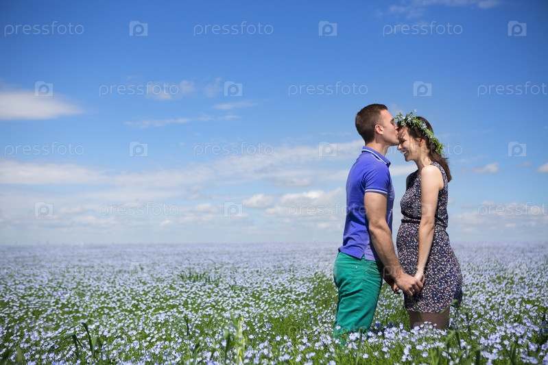 Молодая счастливая красивая пара в поле льна