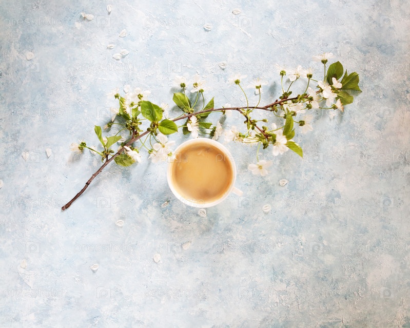 Чашка черного кофе и белые цветы
