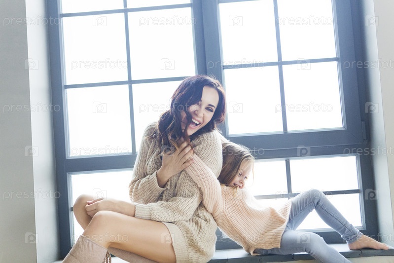 Молодая женщина утром с маленькой девочкой возле окна
