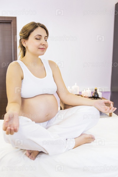 Молодая беременная женщина делает йогу дома
