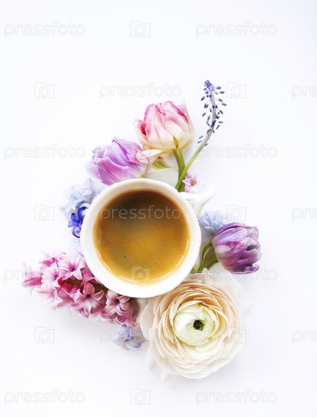 Праздничный фон с красивыми цветами и чашкой кофе
