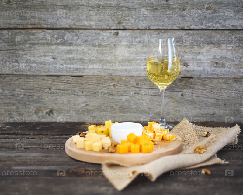 Набор различных видов сыров с бокалом белого вина