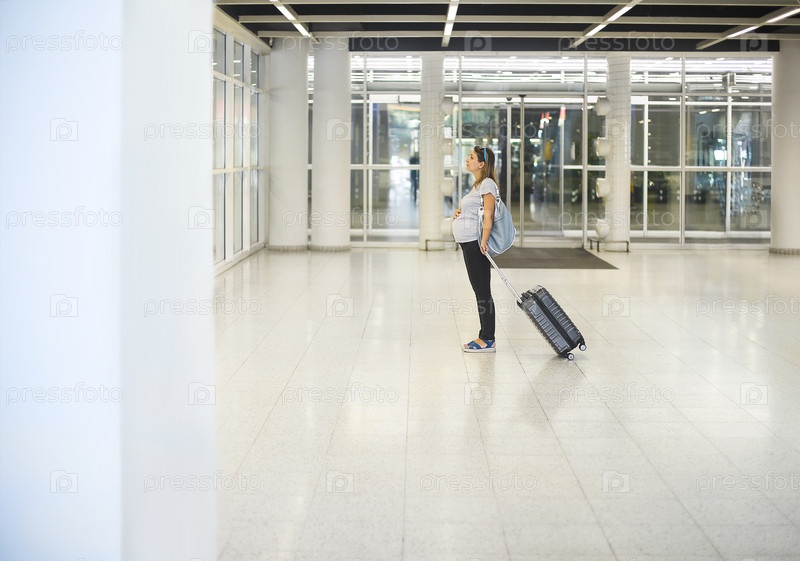 Беременная женщина с чемоданом в аэропорту или на вокзале