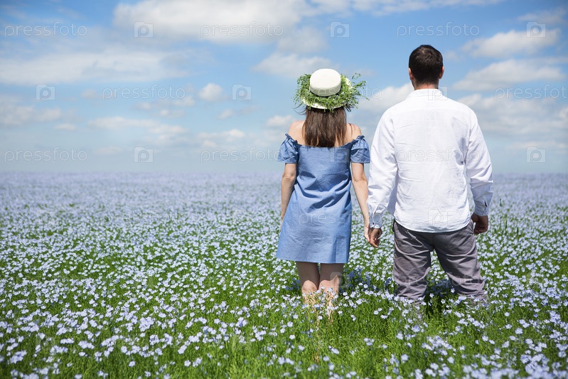 Молодая пара в поле льна