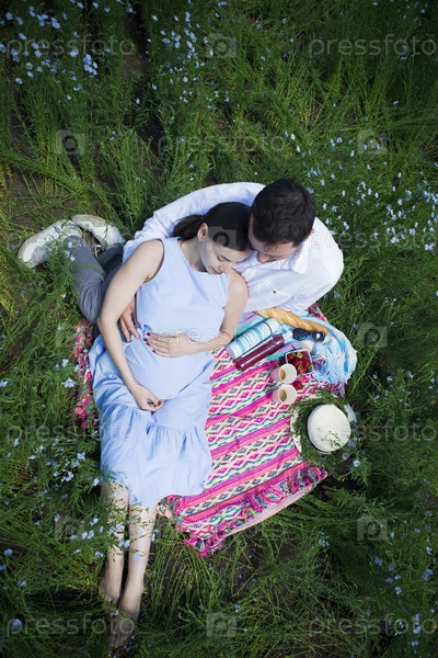 Молодая пара в поле льна