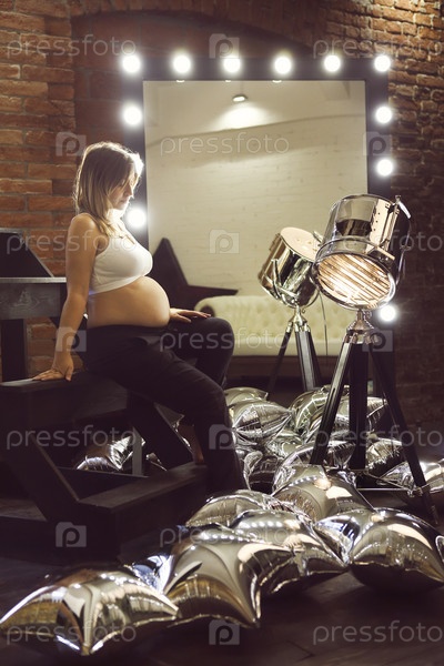 Молодая беременная женщина позирует возле зеркала