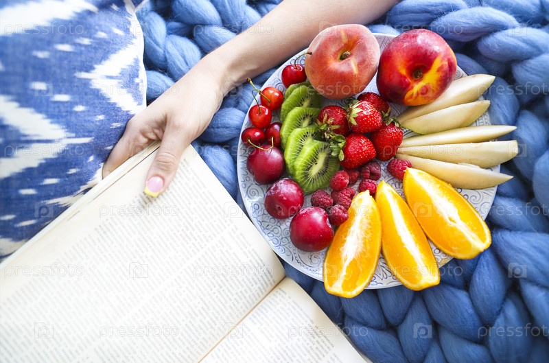 Тарелка с салатом из свежих фруктов на синем пледе