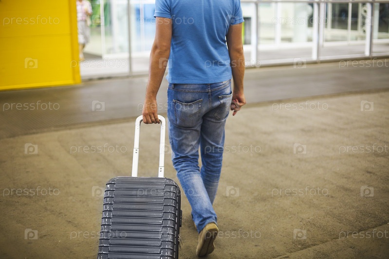 Молодой человек с чемоданом в аэропорту или на вокзале