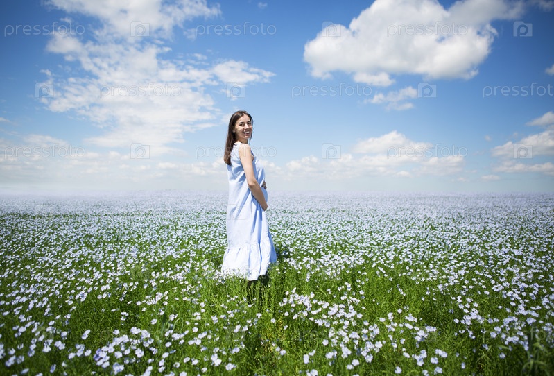 Молодая красивая беременная женщина в поле льна