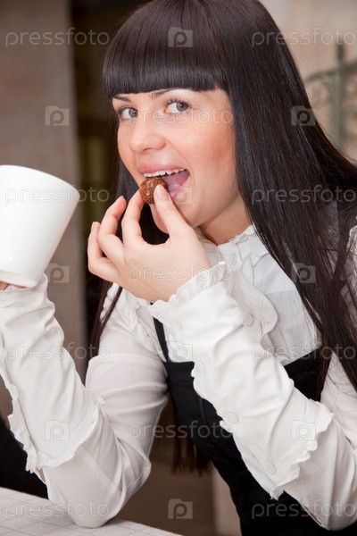 Молодая брюнетка в кафе