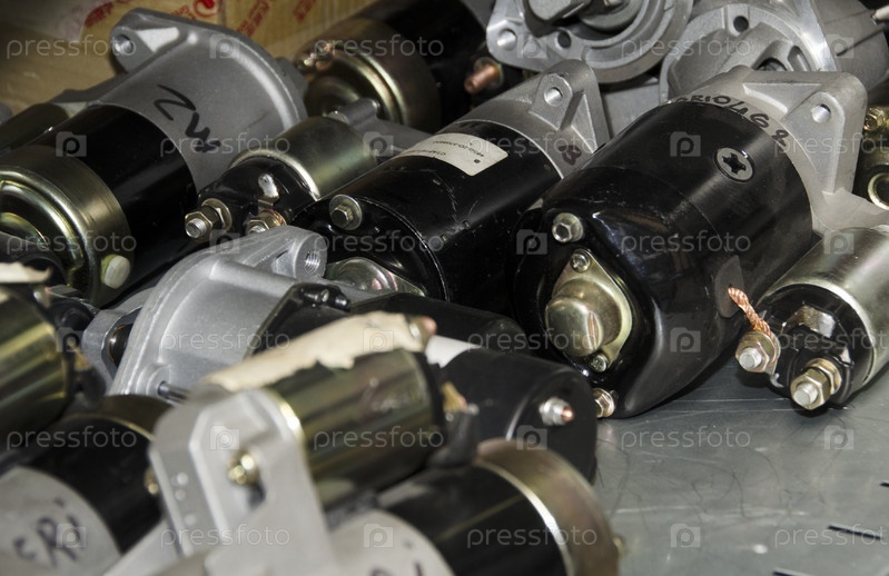 Много серебристо-черных запчастей для автомобиля - стартеров - на складе