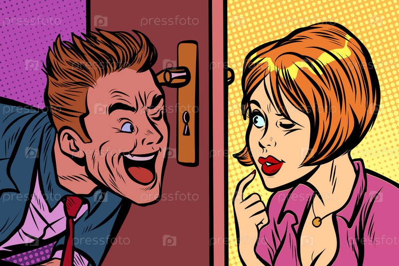 Мужчина и женщина шпионят друг с другом через замочную скважину