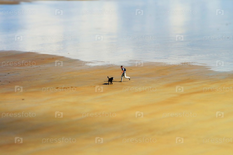 Человек играет со своей собакой на пляже