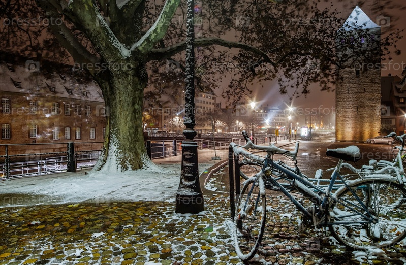 Заснеженные велосипеды на улице, Страсбург