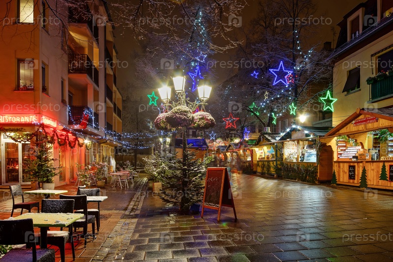 Заснеженные кафе на зимней улице, Страсбург