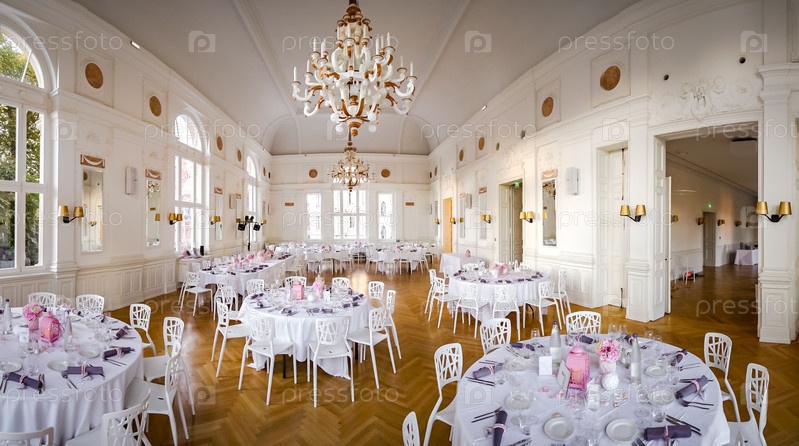 Большой величественный банкетный зал готов к свадьбе