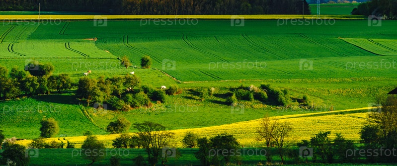 Красивый пейзаж с желтыми и зелеными полями
